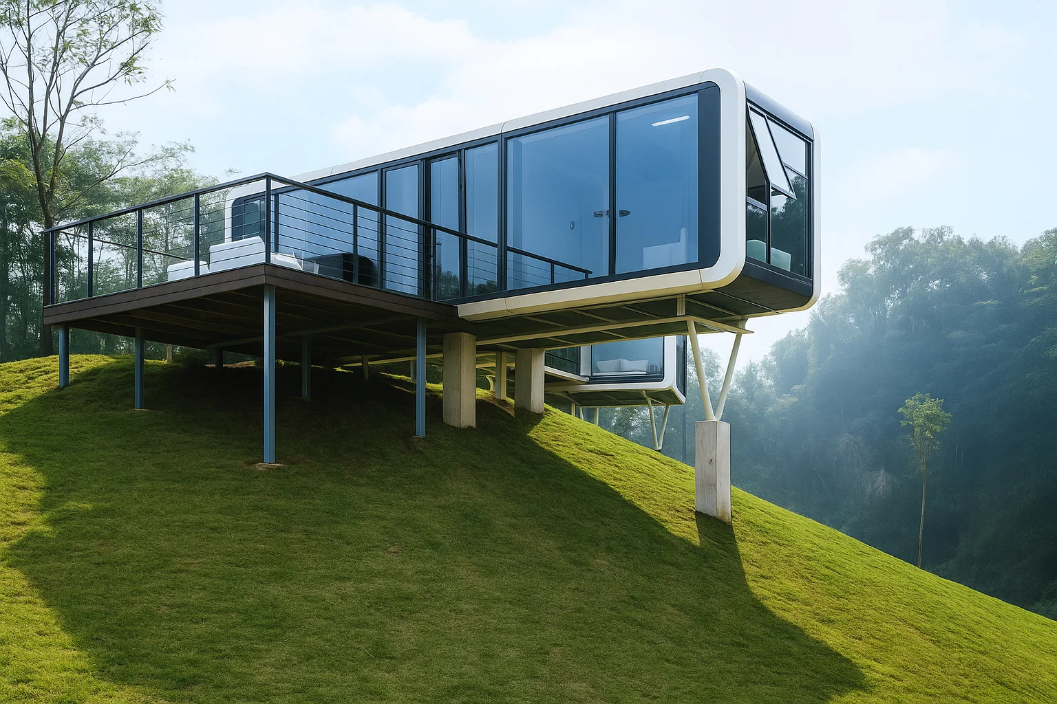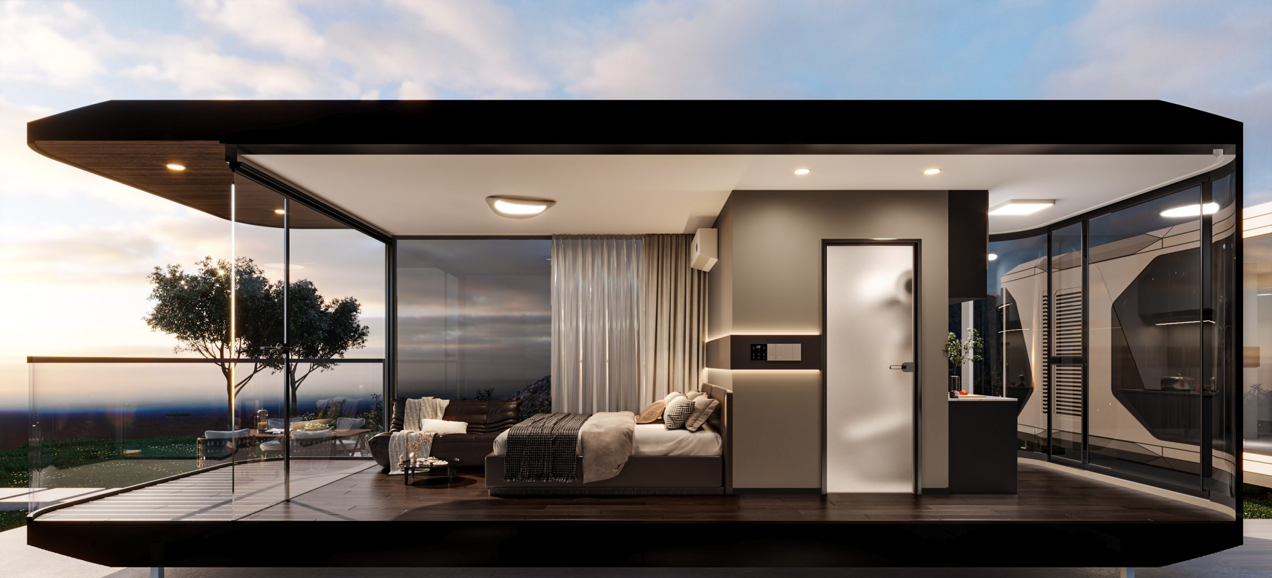 Capsule Corp X prefab house features galvanised steel frame and/or aluminum alloy shell. In addition to the unique technological appearance design, our prefab house is also equipped with panoramic floor-to-ceiling glass and optional balcony, allowing you to get in touch with nature closely. Living facilities are readily available to meet the requirements of simplicity, comfort and high quality of life.