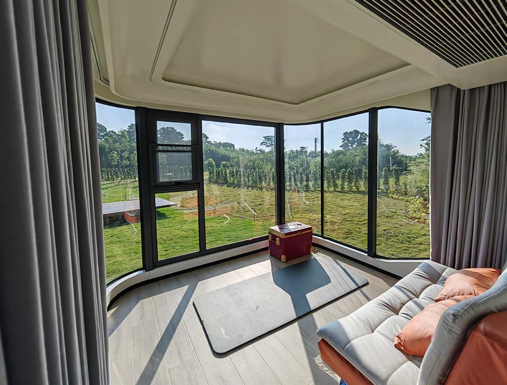270°panoramic french windows, thermal/sound insulation material. Sleep/Work comfortably in the landscape and enjoy pure natural pleasure.